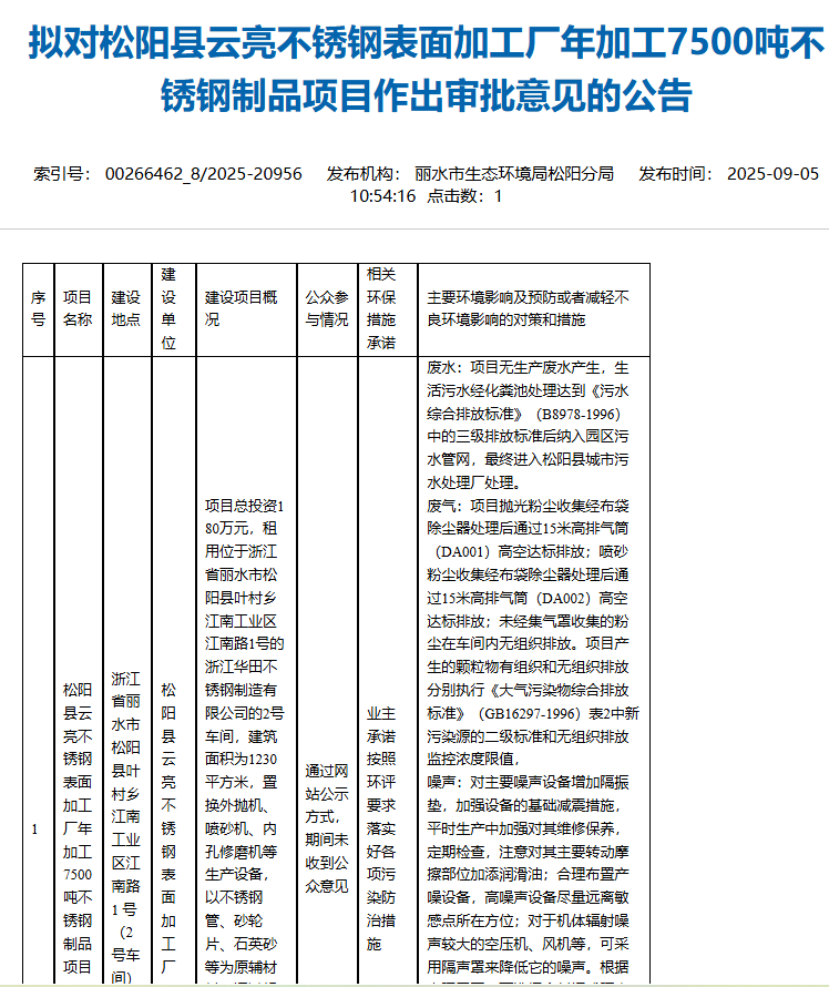 2025年9月5日,麗水市生態環境局松陽分局擬對松陽縣云亮不銹鋼表面加工廠年加工7500噸不銹鋼制品項目環境影響評價報告表作出審批意見并對外進行公告,公告期為:2025年9月5日至2025年9月11日(5個工作日)。